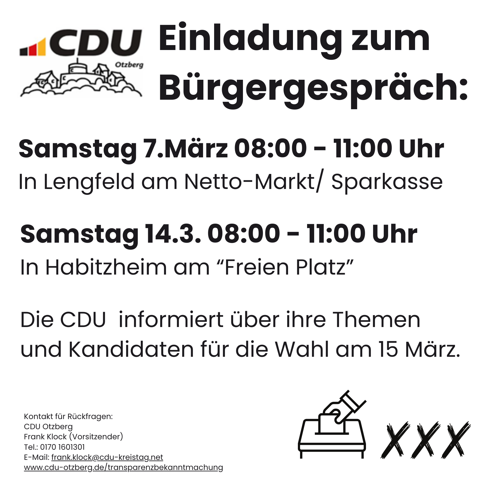 Im Vorfeld der Kommunalwahl am 15. März 2026 lädt der CDU-Gemeindeverband Otzberg alle Bürgerinnen und Bürger herzlich dazu ein, das direkte Gespräch mit den Kandidatinnen und Kandidaten für die Gemeindevertretung und den Kreistag zu suchen. An den nächsten beiden Samstagen wird die CDU mit Infoständen vor Ort sein, um über ihre Ziele für die kommenden fünf Jahre zu informieren und Anregungen aus der Bevölkerung entgegenzunehmen.